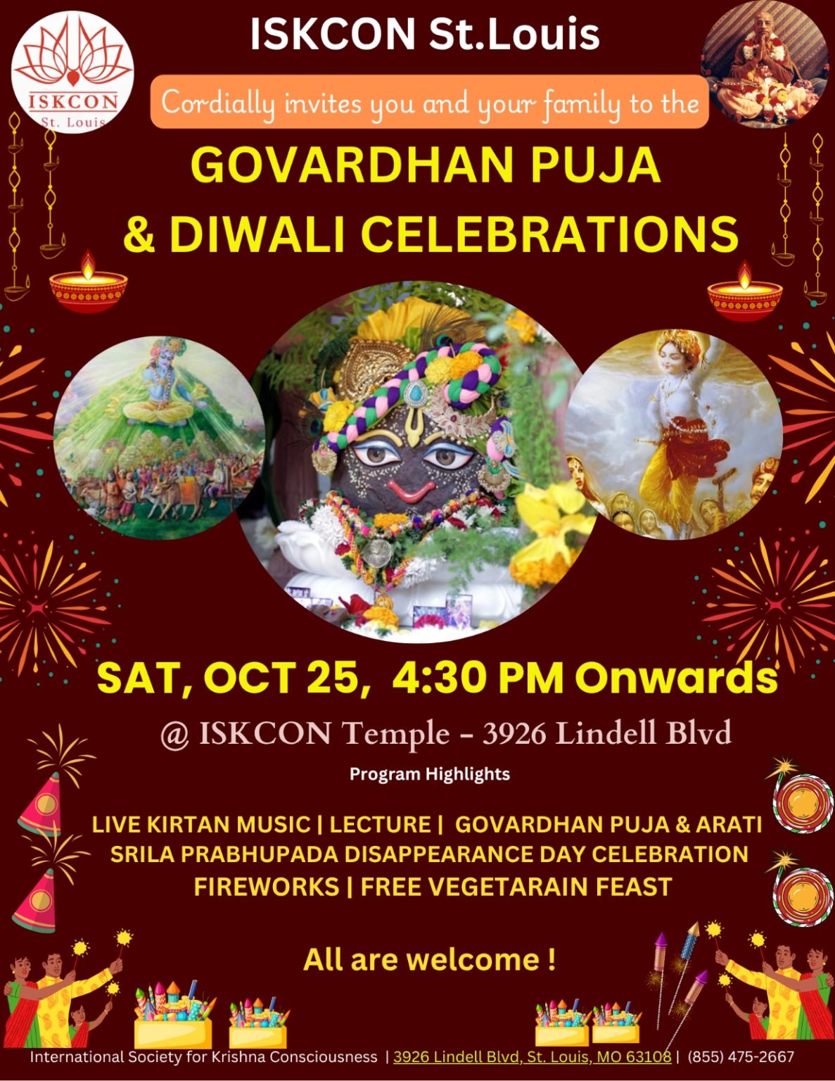 GOVARDHANA PUJA & DIWALI CELEBRATIONS SAT, OCT 25TH, 4:30 PM ONWARDS SPONSoRSHIP OPPORTUNITIES FireWorKS DONATE - $151 Flowers DONATE - $201 fruits DONATE - $100 Govardhan Hill Donate - $251 PRASADAM DONATE - $351 govardhan ARATI DONATE - $51